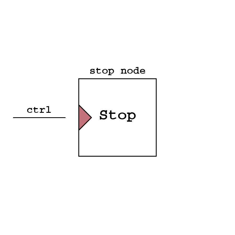 Stop - узел, являющийся финальным для программы, он позволяет прекратить работу программы по получению сигнала.