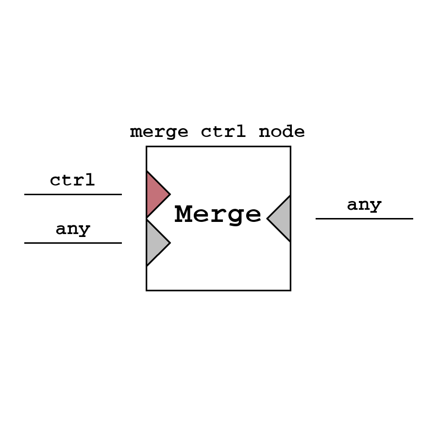 Merge Control - узел, объединяющий сигнал и значение с разных узлов. Узел возвращает значение с сигналом только в том случае, если подан сигнал на управляющий вход, иначе сигнала не будет. Информация с управляющего сигнала не забирается.