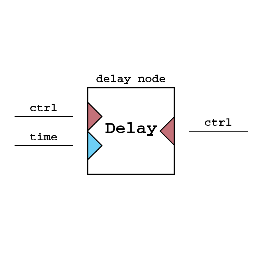 Delay - узел для задержки входящего сигнала на целое количество тактов программы. При подаче нуля отправляет сигнал на следующую итерацию.