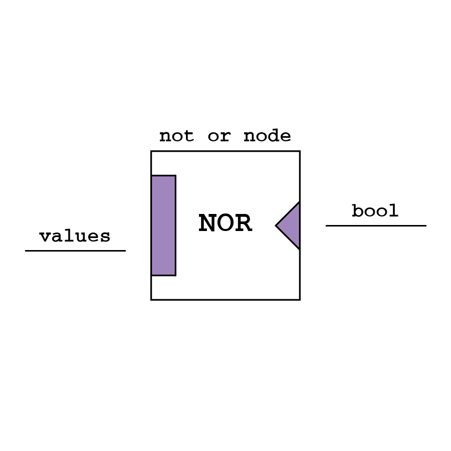 Not Or - логический узел ИЛИ-НЕ, который возвращает инверсию логического сложения между всеми входами (значения автоматически приводятся в bool).