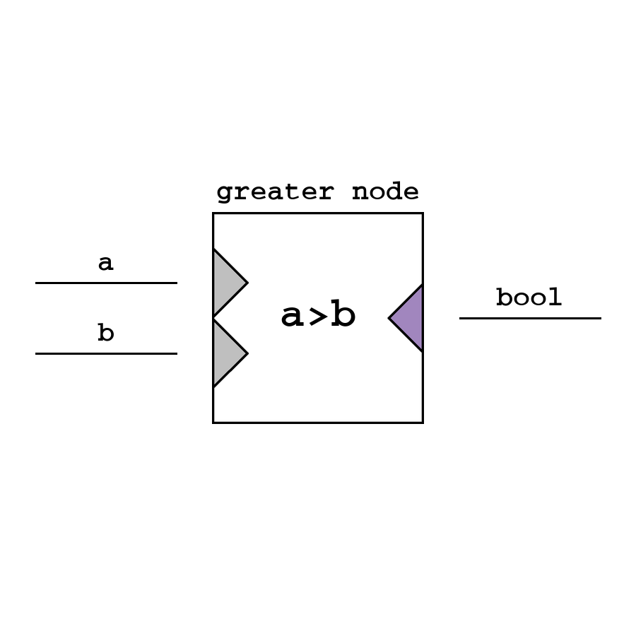 Greater - логический узел Больше, который возвращает сравнение на больше между верхним и нижним входом (значения автоматически приводятся в bool).