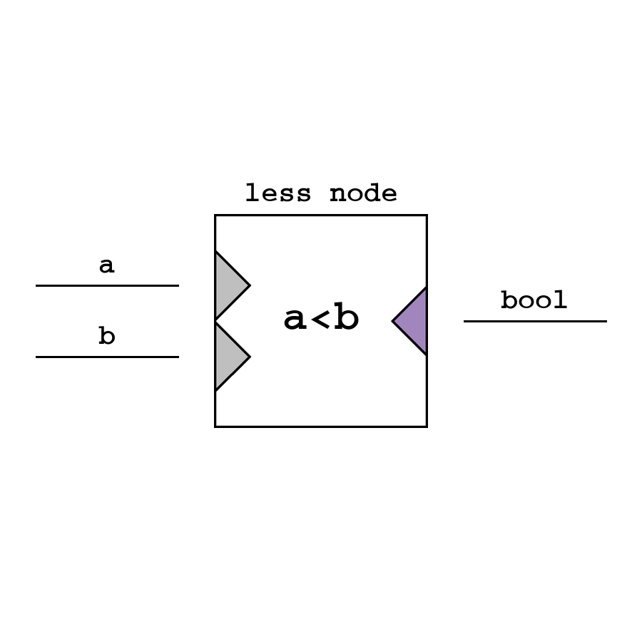 Less - логический узел Меньше, который возвращает сравнение на меньше между верхним и нижним входом (значения автоматически приводятся в bool).