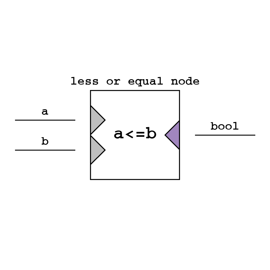 Less or Equal - логический узел Меньше-или-Равно, который возвращает сравнение на меньше или равно между верхним и нижним входом (значения автоматически приводятся в bool).