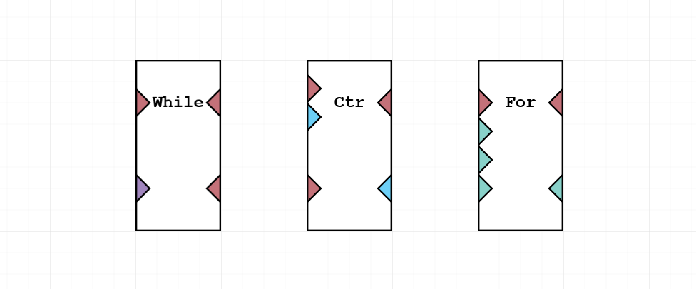 Генерация формы происходит автоматически, однако существует возможность изменить размеры узла. Стандартно при небольшом количестве входов и выходов узел имеет форму квадрата 1x1 (блок), однако для циклов и похожих узлов форма расширяется по высоте, доходя до 1x2 (два блока). Расширение по горизонтали возможно. Слева узла находятся входы, справа выходы.