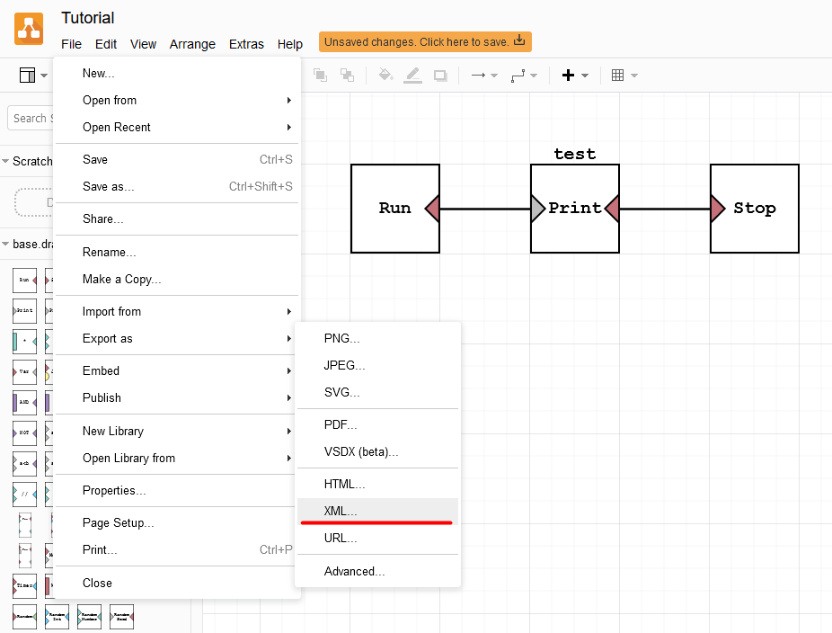 Внутри Drawio.io в меню нужно выбрать “File” > “Export as” > “XML”.