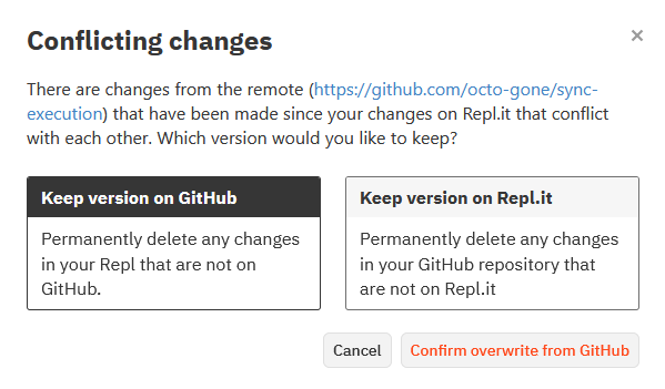 Возможно возникновение конфликтов: ваши созданные или измененные файлы не сопоставимы с файлами из Git. Тогда требуется сохранить важные измененные данные и загрузить данные с GitHub.