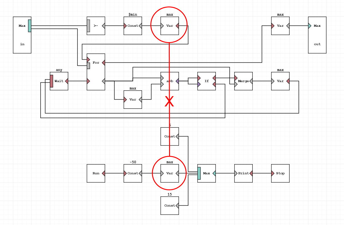 Запускающий функцию узел выглядит как обычный узел, а определяющие выглядят как обратные к нему. Входной узел имеет выходы, которые являются входами функции. Следовательно, если попытаться разложить функцию, то все подключенные ко входу узлы нужно подключить так, чтоб они были подключены ко всем узлам подключенным к входному определяющему узлу. Аналогично и для выходов функции.